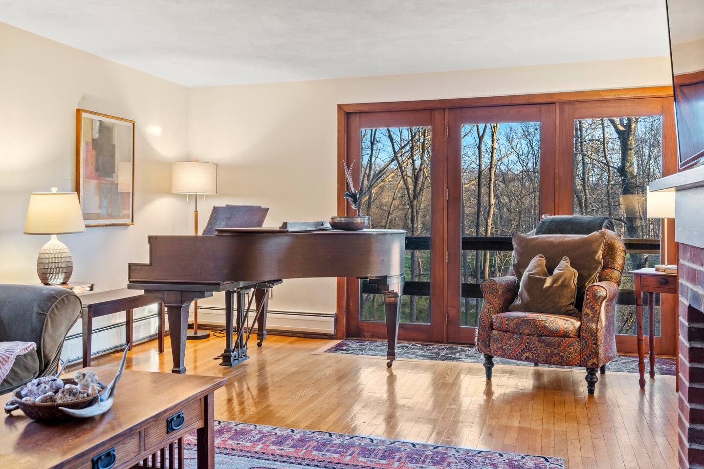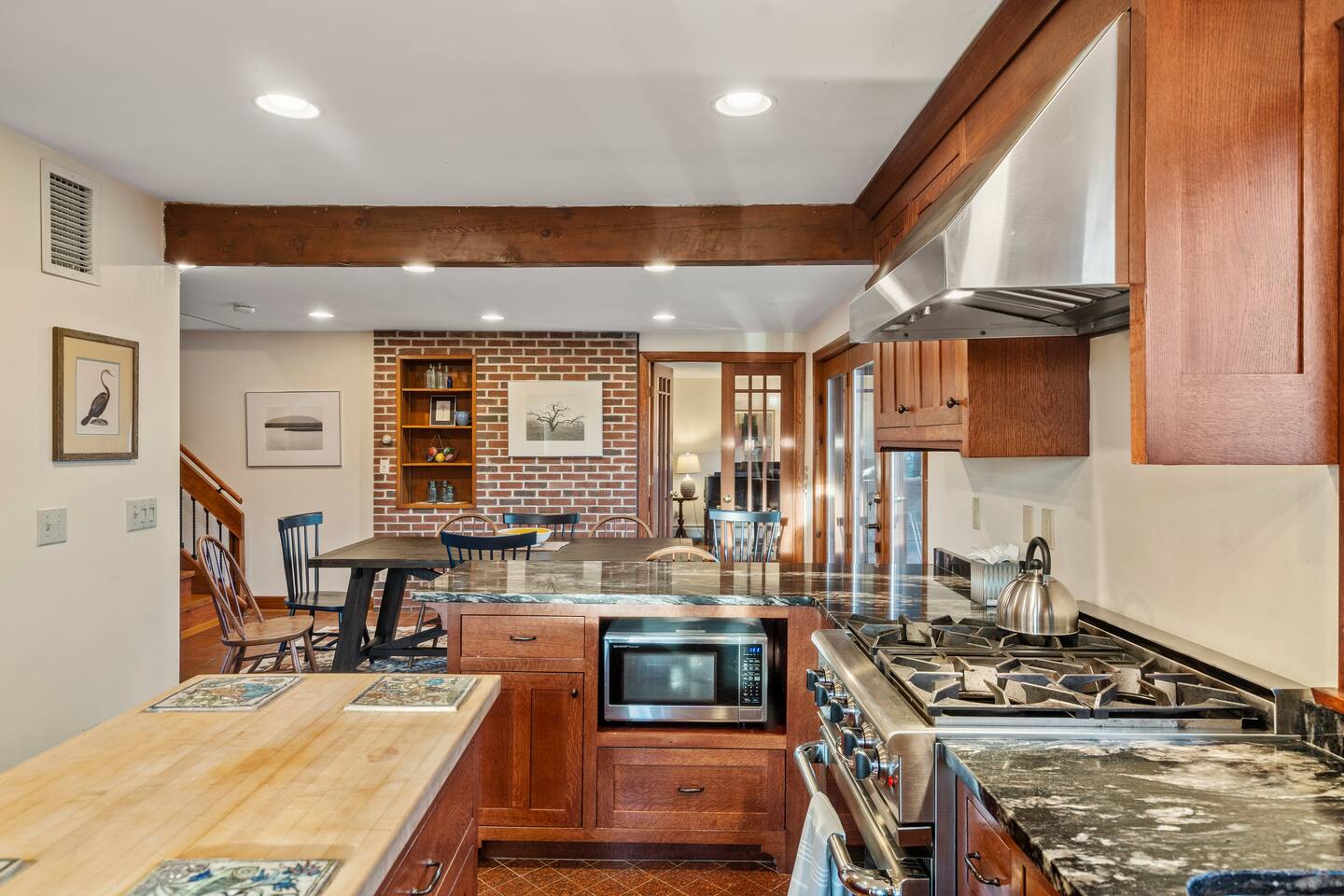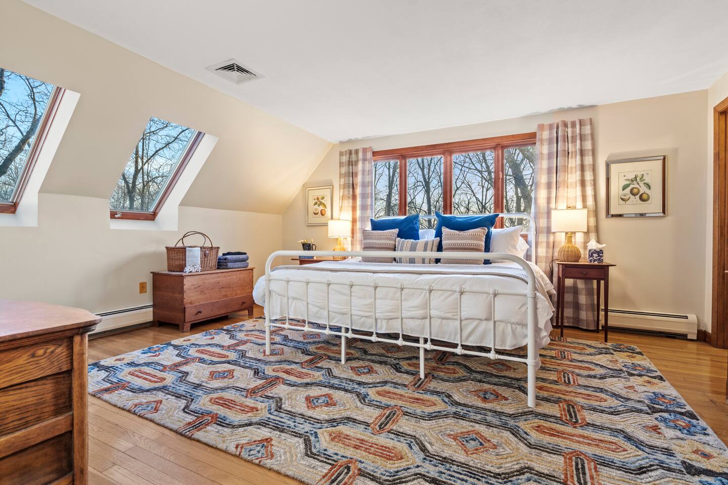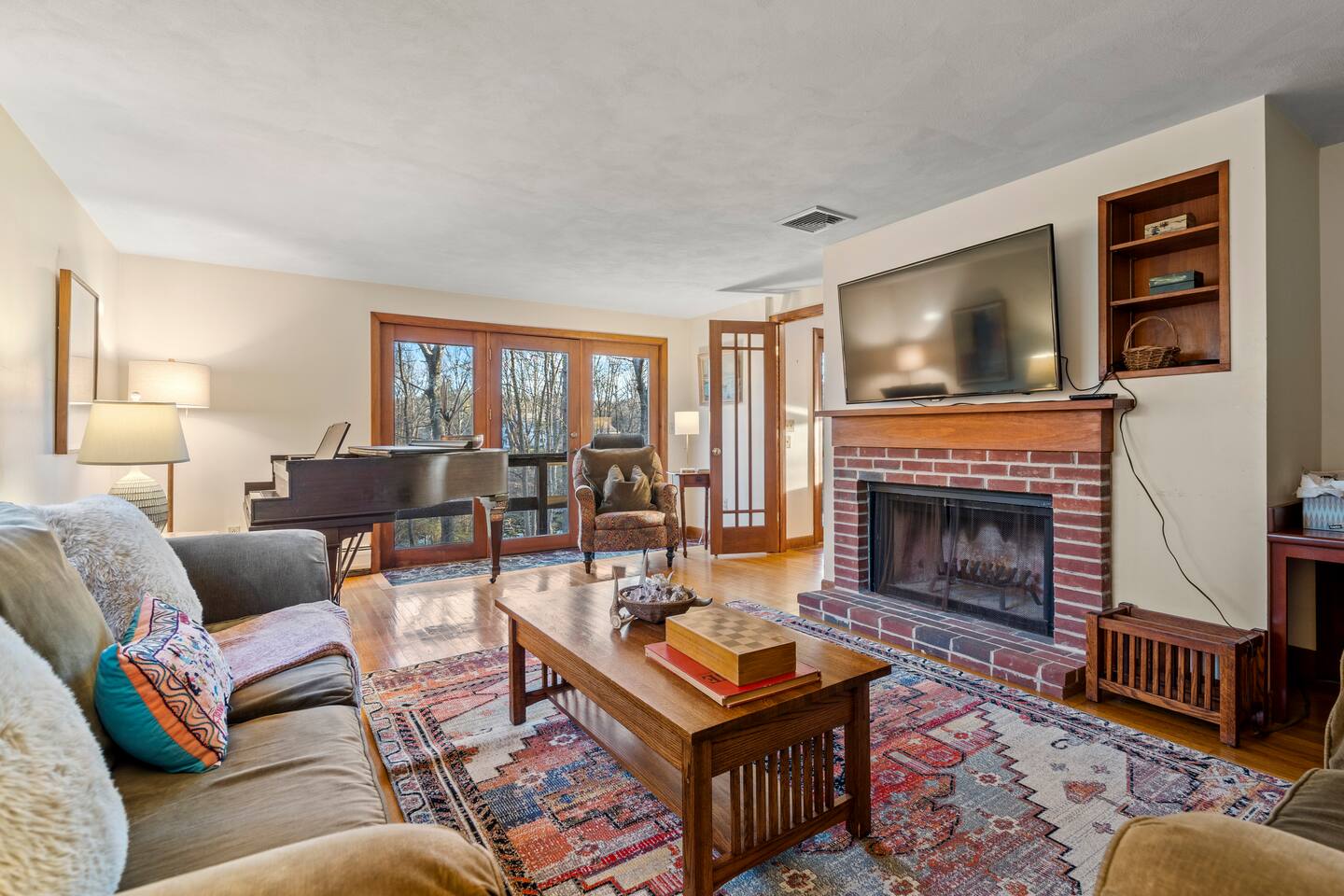 KEY FEATURES: ☀ Private riverfront access with 2 kayaks and 2 canoes included! ☀ Large great room with heated floors ☀ Sleeps 10; 5 bedrooms, 2 king, 2 queen + 2 twins ☀ Stocked with family friendly amenities - pack and play + booster seat ☀ 2 dining areas and 2 living rooms ☀ 2.5 Bathrooms ☀ Modern and well-equipped kitchen with plenty of seating options ☀ 12 acres of private land overlooking the Ipswich River ☀ Patio with grill and plenty of outdoor seating ☀ Hi-Speed WiFi and Smart TV ☀ Barn stocked with beach gear including chairs, boogie boards, and life vests ☀ Bring your horses - we have 3 horse paddocks and 3 stable barn ready for them! ☀ Quick drive to downtown Ipswich and Crane Beach ☀Right along the Essex County trail network, allowing direct access to miles of horse, foot or bike trails! ☆☆ BARN + OUTSIDE SPACE ☆☆ Pull into the long driveway and you will be amazed at the amount of land this estate sits on! It's an equestrian's dream - bring your horses and your hay and we include 3 private horse paddocks and a 3 stable barn. You won't need to go far to take a walk in nature - beautiful trails cut right through the property. The barn is stocked with beach gear including chairs and boogie boards. Head down to your private riverfront and you'll find 2 kayaks and canoes included in your stay! A stone patio outside the house has outdoor seating and a new gas grill perfect for enjoying meals al fresco while taking in the calming sights and sounds of the Ipswich River. ☆☆ MAIN FLOOR ☆☆ Enter the split level house and you'll immediately understand why this is the perfect lodge for group retreats. The main floor has a large great room with plenty of seating and opens up to the dining area so there is space for all to gather. There is no shortage or windows to overlook your natural surroundings. The kitchen is fully equipped with all the appliances, utensils and cookware you need to feel at home. The group's cooks will enjoy stainless appliances, stone counters, and a gas stovetop. This thoughtfully-designed home provides an additional dining area right off the kitchen with seating for 8. The final gathering space on this floor is the "den" complete with grand piano, decorative fireplace and a 55" TV with Roku entertainment system, allowing full access to your favorite streaming services. This room has so many options for use as it has doors for privacy. Shut the doors and use the desk setup as a remote workspace. Send the kids in here for a movie night while the adults use the Great Room space. Use the board games provided and make this the game room. The possibilities are endless! ☆☆ UPSTAIRS ☆☆ Head up the stairs and you'll find a large master bedroom with King Bed and 2 walk in closets. There is an ensuite bathroom here (with bidet!) that can also be accessed by the hallway so that the second upstairs bedroom can use this floor's full bathroom. The second bedroom on this level is fitted with a queen-size bed and is the perfect place to unwind with skylights and natural decor. ☆☆ DOWNSTAIRS ☆☆ Head downstairs or come in through the "mudroom" a common space with tiled floor perfect for entering after a day adventuring in the river. A full bathroom with walk in shower is on this level making it easy to clean up after the time outdoors. There are three additional bedrooms on this level each thoughtfully designed with their own fun personality. There is a bedroom of 2 twin beds, a King bedroom and a Queen bedroom giving so many options to sleep for families and groups alike! We have family friendly amenities in where you'll also find provided pack and play and booster sleep so babies/toddlers can comfortably be accommodated without packing all the extra gear. All this only minutes away from charming downtown Ipswich and beautiful Crane Beach! ★☆ Book Today & Let Us Take Care Of You at the Ipswich River Lodge! ☆★