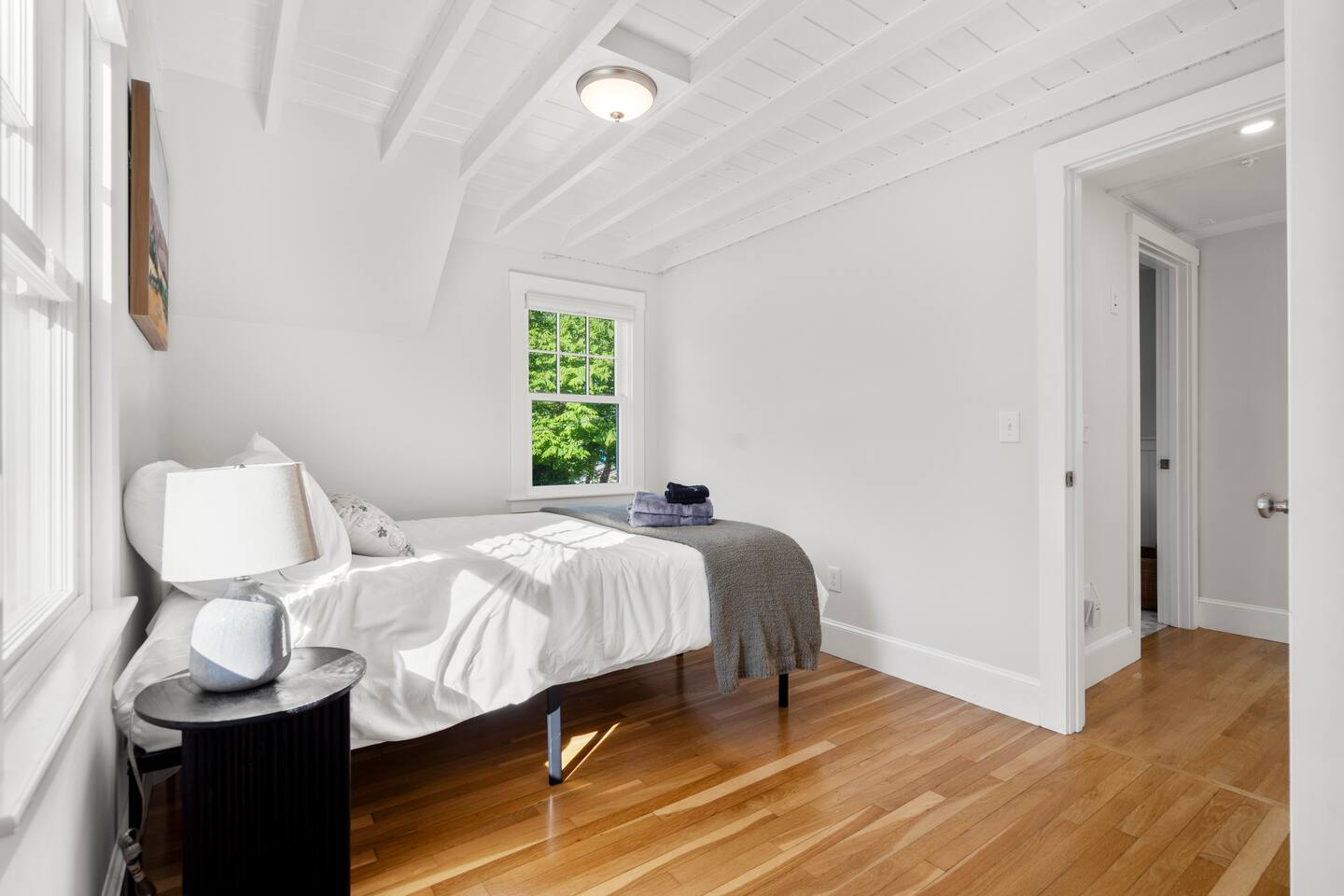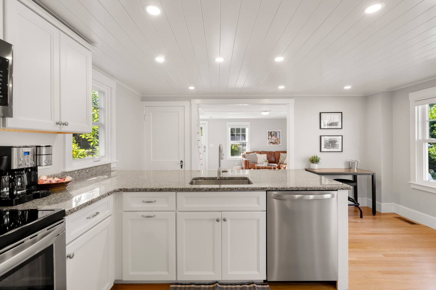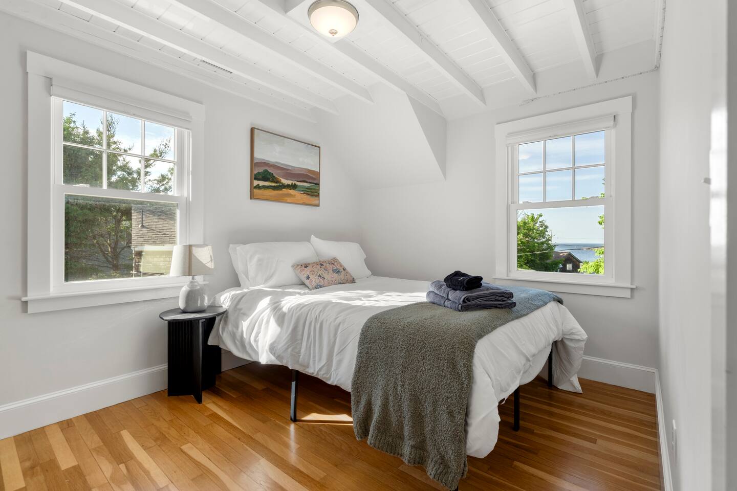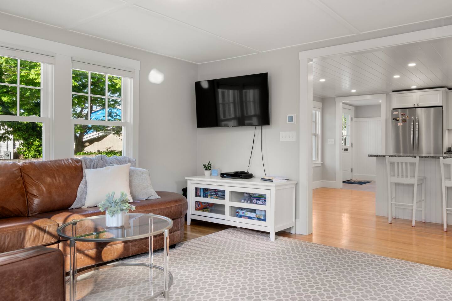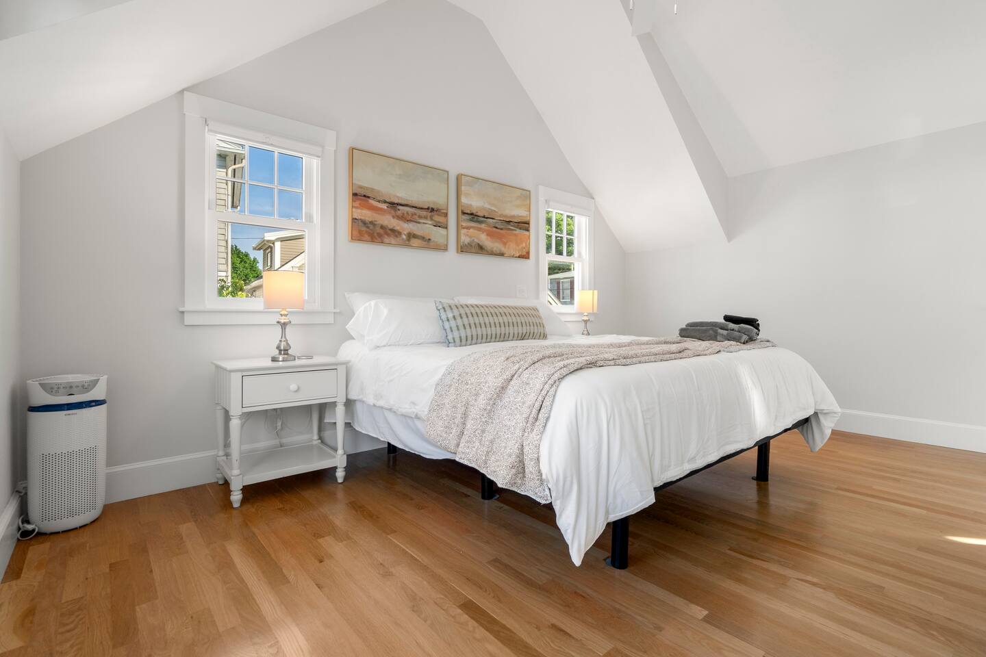 This charming seaside cottage is newly renovated with lots of modern conveniences and plenty of original character. You're only steps away from the center of historic and picturesque downtown Rockport. ☆☆ FIRST FLOOR ☆☆ Pull up the the house and enjoy your reserved parking (a luxury in downtown Rockport!). The first floor of the home is an open concept space with living room, dining area, and kitchen all connected. The cozy kitchen is fully equipped with all the appliances, utensils and cookware you need to feel at home. There's room for 4 at the bar or just walk a few steps to take your meals to the beach! The living room has a comfortable sectional sofa and is kitted with a smart TV, allowing full access to your favorite streaming services. This space is also stocked with games and toys making it the perfect place to unwind at the end of a long day of exploring. ☆☆ SECOND FLOOR ☆☆ Climb up the stairs and you'll find two generous sized bedrooms to accommodate 4 guests. The primary bedroom is fitted with a King-size bed and walk in closet (perfect for a pack and play!). There's even a convenient washer and dryer tucked in there perfect for drying off wet suits after a day at the beach! The second bedroom has a queen size bed and plenty of room to unpack in the closet. You'll also find a twin sized air mattress here that can sleep an additional adult or kid in the bedroom or living room! The second floor also has the renovated full bathroom with large walk in shower. Outside the house you'll find a bin stocked with beach chairs and toys. All this just steps away from all the sights and attractions of Rockport! ★☆ Book Today & Let Us Take Care Of You at the Back Beach Bungalow! ☆★