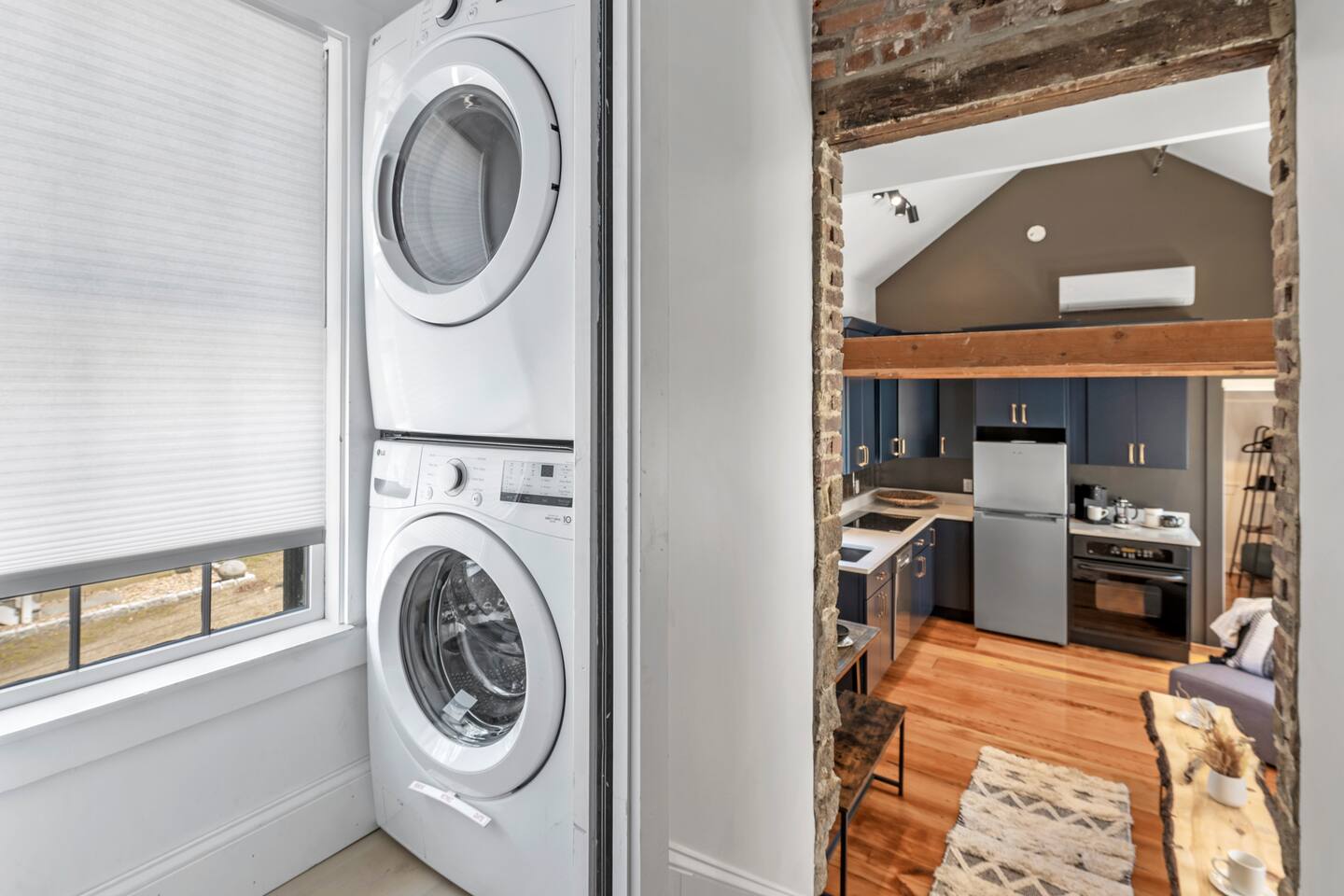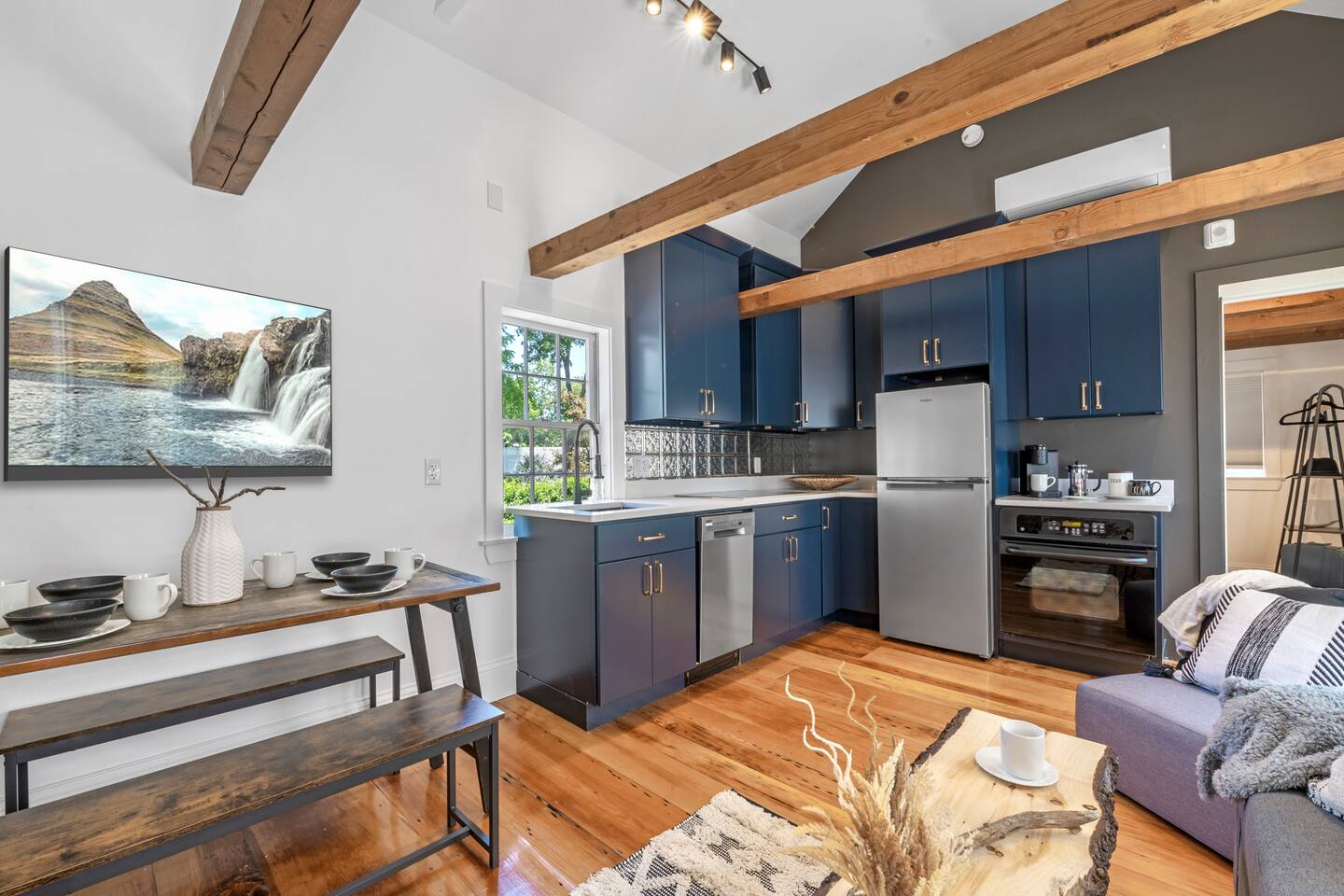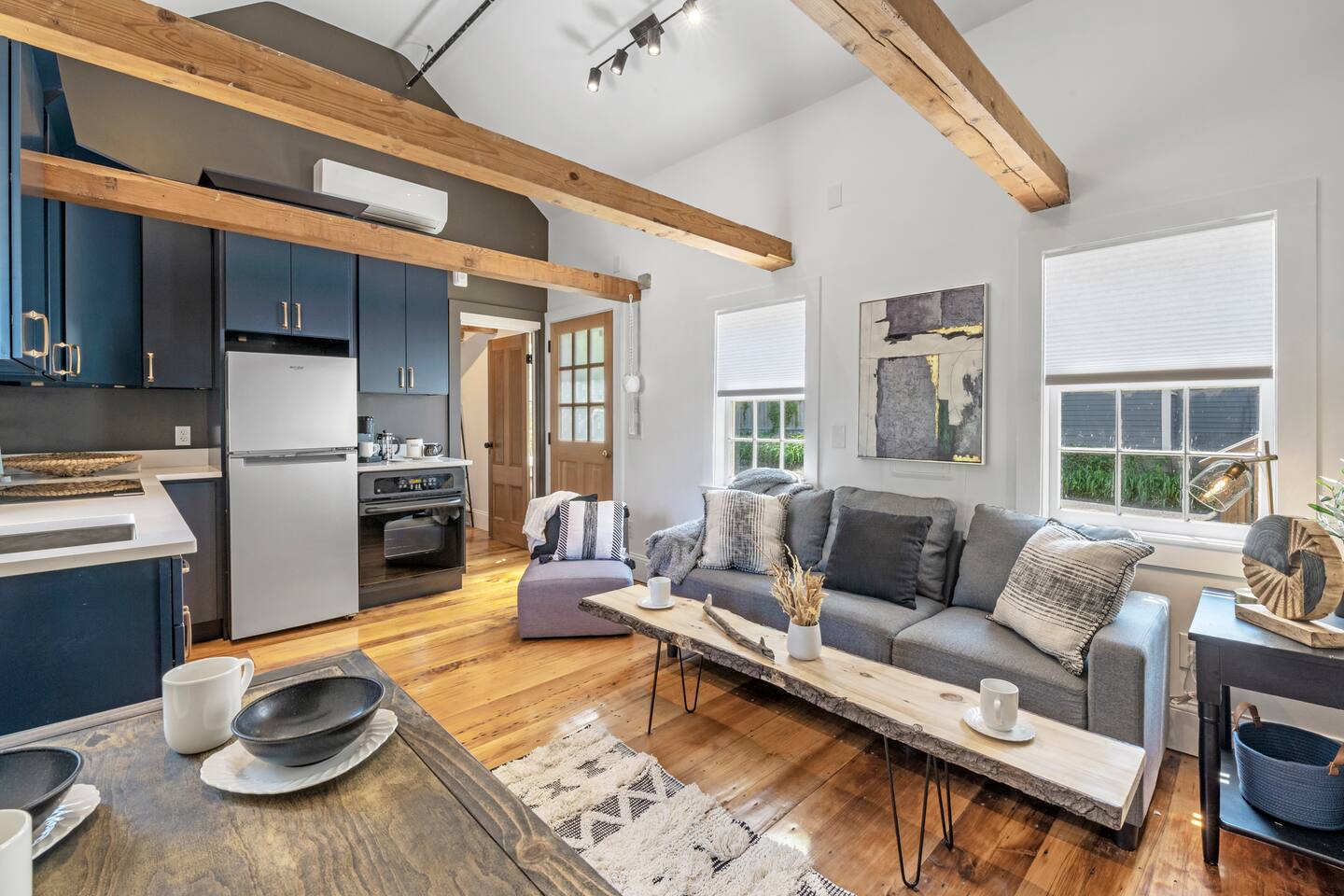 This cozy historic bookstore has been transformed into a chic 2 bedroom space for a unique Rockport experience! Enjoy the convenience (and rare amenity in dowtown Rockport!) of 2 reserved parking spaces. Step into this pre-1900 space and you'll be greeted by an open space full of rich colors and light. The vaulted ceilings and exposed beams are the perfect backdrop to this central gathering spot. A colorful kitchen is fully equipped with everything you'll need for meals. Relax on the sofa and stream your favorites on the 4K smart TV. On one end of this living space you'll find the first bedroom. More high ceilings and exposed beams along with a large king sized mattress make this feel like a spacious retreat. On the opposite end of the living area you'll step up to find the washer+dryer and full bathroom with standup shower. The bedroom on this end of the apartment has colorful accents and a convenient remote workspace. All spaces have been professionally designed with gorgeous details and colors throughout. The historic character of this charming New England space has been preserved for your enjoyment without sacrificing comfort or modern style! Not to mention you are just steps away from all that quaint downtown Rockport has to offer!