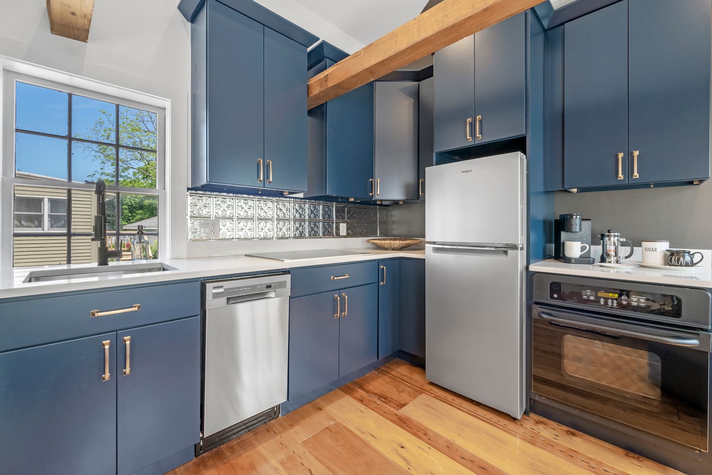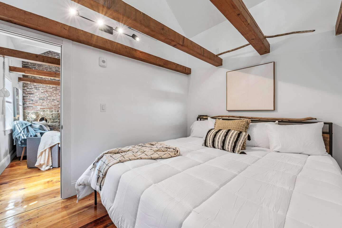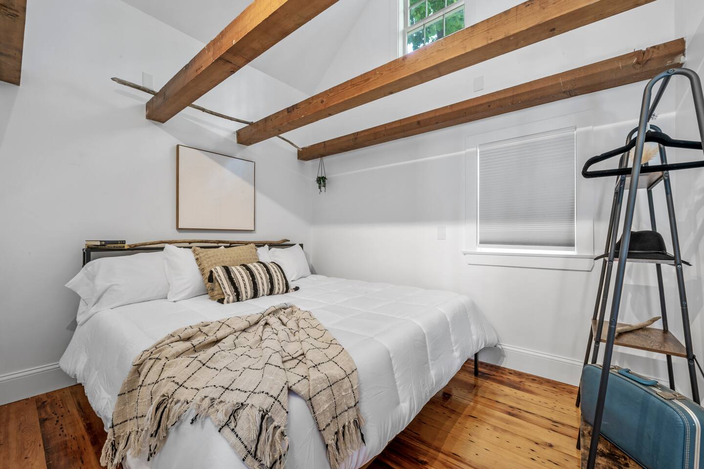 This cozy historic bookstore has been transformed into a chic 2 bedroom space for a unique Rockport experience! Enjoy the convenience (and rare amenity in dowtown Rockport!) of 2 reserved parking spaces. Step into this pre-1900 space and you'll be greeted by an open space full of rich colors and light. The vaulted ceilings and exposed beams are the perfect backdrop to this central gathering spot. A colorful kitchen is fully equipped with everything you'll need for meals. Relax on the sofa and stream your favorites on the 4K smart TV. On one end of this living space you'll find the first bedroom. More high ceilings and exposed beams along with a large king sized mattress make this feel like a spacious retreat. On the opposite end of the living area you'll step up to find the washer+dryer and full bathroom with standup shower. The bedroom on this end of the apartment has colorful accents and a convenient remote workspace. All spaces have been professionally designed with gorgeous details and colors throughout. The historic character of this charming New England space has been preserved for your enjoyment without sacrificing comfort or modern style! Not to mention you are just steps away from all that quaint downtown Rockport has to offer!